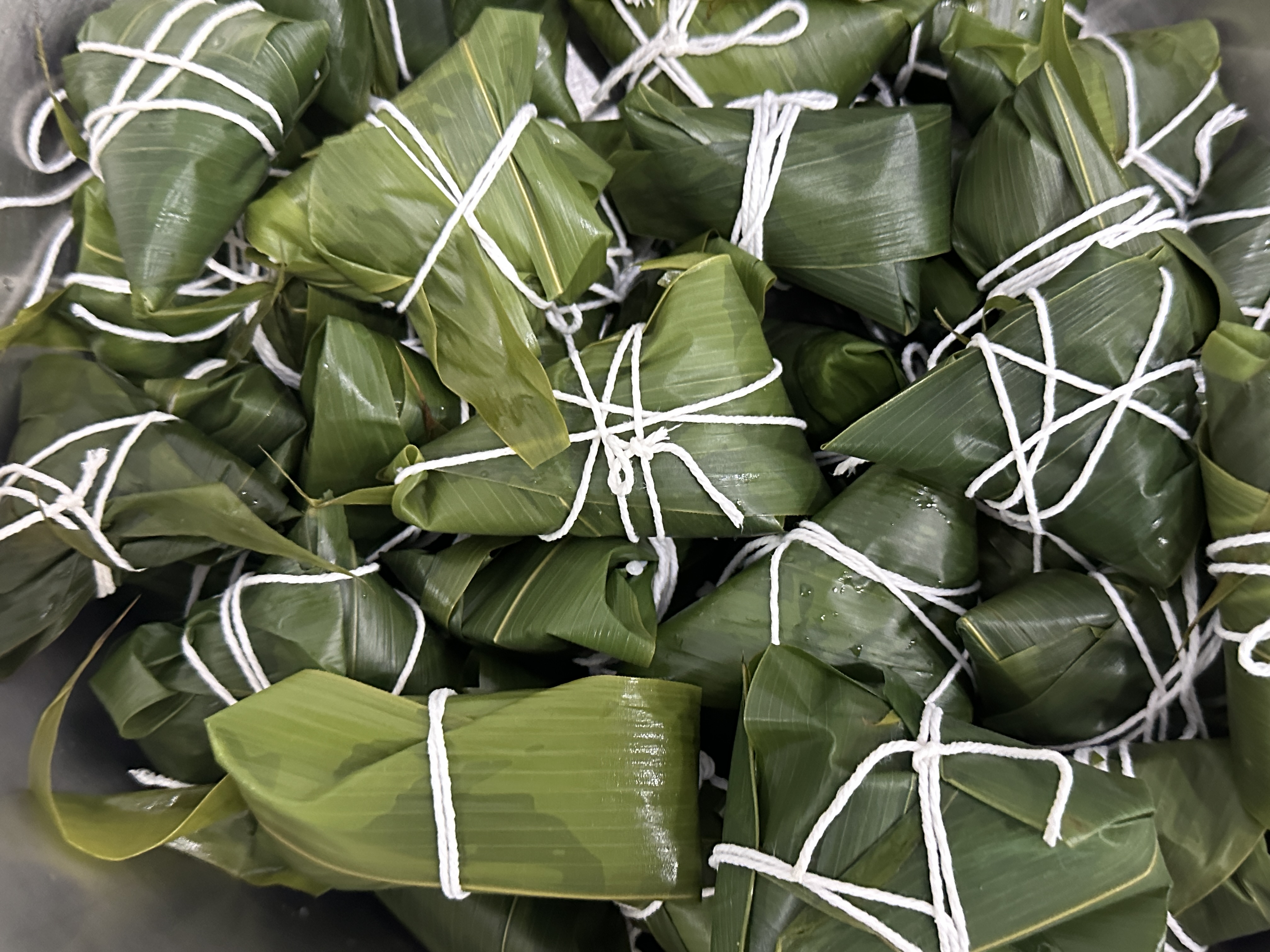 活動(dòng)現(xiàn)場(chǎng)歡聲笑語(yǔ)、粽香四溢。工作人員將提前泡好的糯米、粽葉、蜜棗等材料整齊地?cái)[在桌子上,大家圍在一起,紛紛拿出看家本領(lǐng),從折粽葉、裝糯米,到放餡料、裹扎繩,大家交流切磋、互相學(xué)習(xí),既有分工,又有合作。不一會(huì)兒,清香的粽葉,晶瑩的糯米,變成了一個(gè)個(gè)精致飽滿的粽子?;顒?dòng)現(xiàn)場(chǎng),大家相互學(xué)習(xí),互相交流,共話端午習(xí)俗,感受濃濃的節(jié)日氣氛。