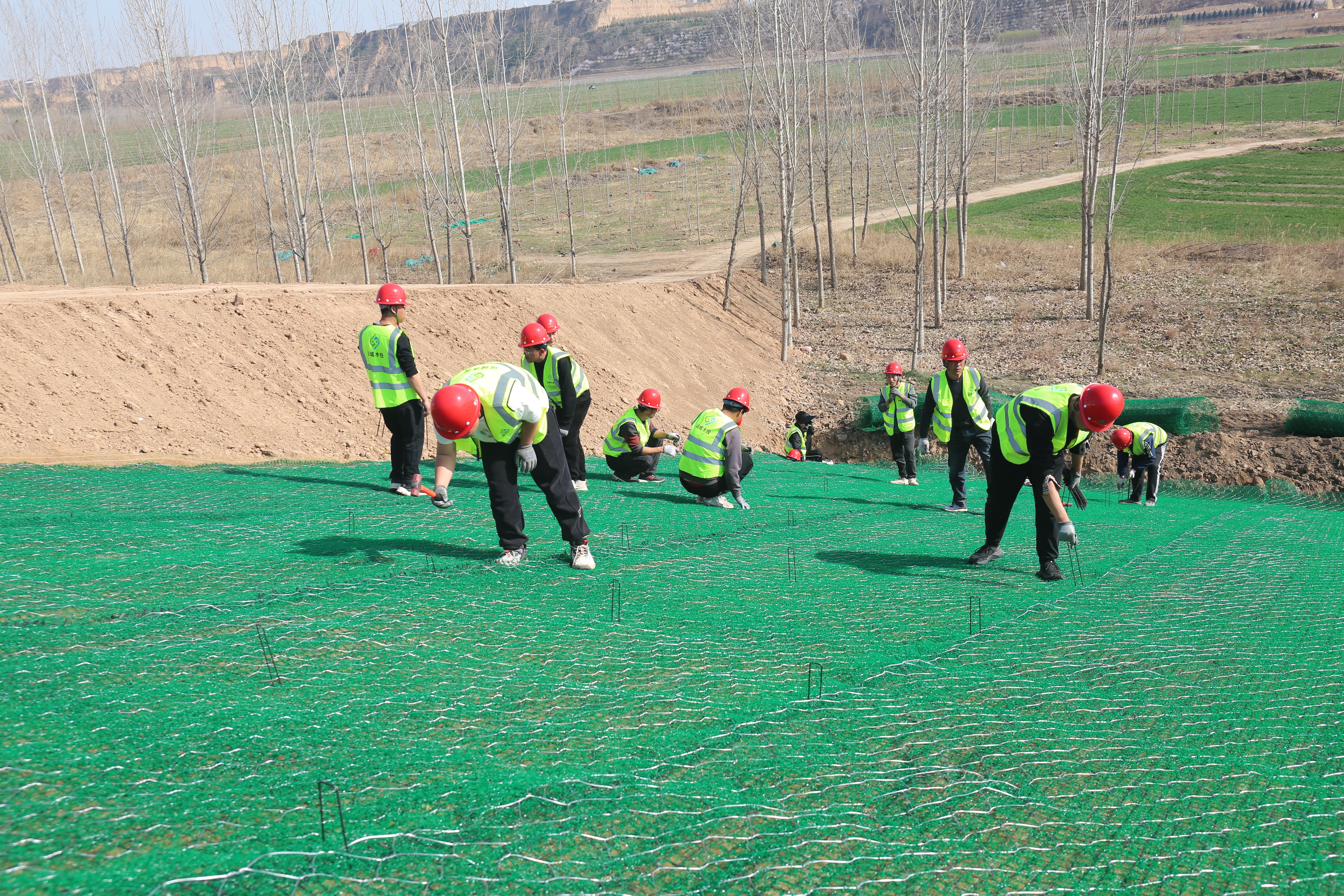 施工現(xiàn)場(chǎng),工程機(jī)械、運(yùn)輸車輛、施工人員正在加緊作業(yè)。一片片椰絲毯經(jīng)過(guò)清除坡面雜物、坡度整修、開挖坑槽、播撒草籽等八道程序才能完好鋪設(shè)在大壩上。椰絲毯是一種新型環(huán)保材料,具有良好的吸水性、保濕性和透氣性,這種環(huán)保材料既可以起到穩(wěn)固河道邊坡、防止河岸沖刷破壞的作用,同時(shí)還能優(yōu)化生態(tài)環(huán)境。
